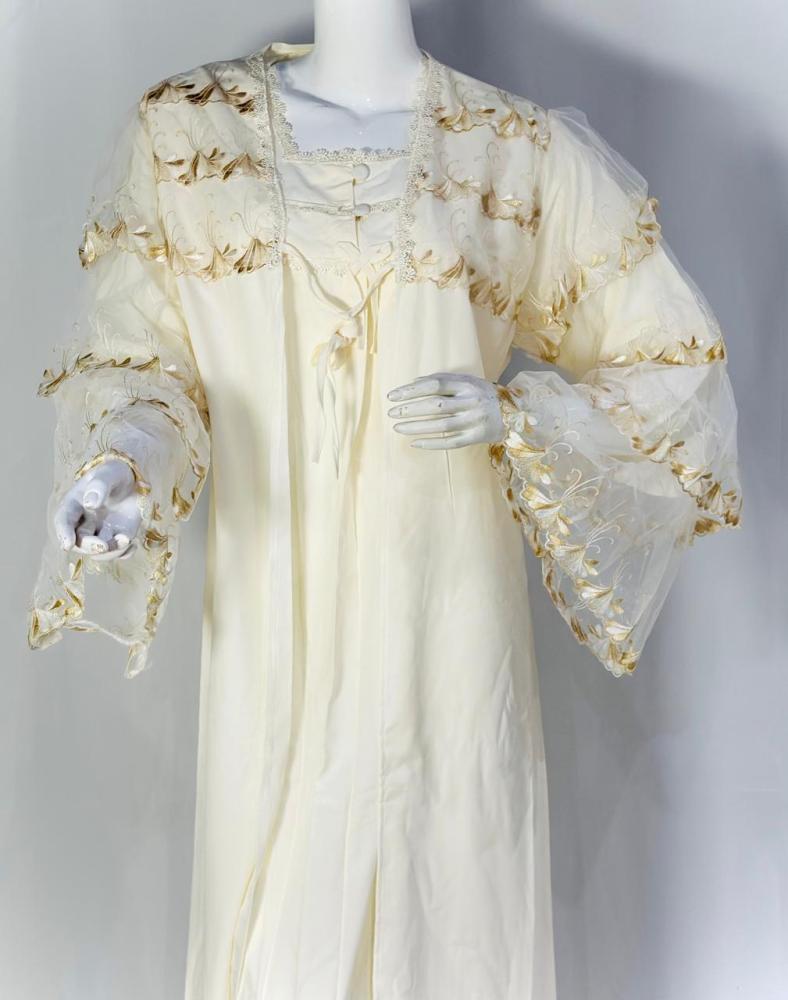 تتميز ملابس استقبال النفاس بتصميم أنيق ومريح، مزينة بدانتيل مزخرف وأكمام طويلة بتطريزات ناعمة و كشكشة أنثوية بالإضافة إلى حزام قابل للتعديل لضمان ملاءمة مثالية لإطلالة فاخرة.
